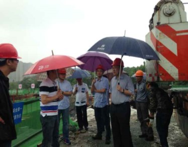 2015年9月29日,因第21号台风“杜鹃”预计登陆东部沿海省份,杭州市建委组织8支检查小组对市内在建工程相关防御台风准备工作进行检查,其中由杭州市建委主任丁狄刚主任带队的小组莅临我公司东风港项目部进行检查,主要检查施工现场的防汛工作准备情况,重点检查的部位有:一是在建工地基坑、边坡、塔吊、物料提升机、脚手架、活动房、围挡等部位;二是市区河道整治围堰、河道阻水物、河道过水断面等部位。王主任对我项目部的施工环境和各项安全措施比较满意,在跟现场施工作业人员交谈时,再三嘱咐工作时务必要小心谨慎,确保人身安全,此外也对项目的工程进度进行了了解和指导,要求年底完工,按时保障道路通行。我项目部负责人表示将不负领导重托和民生所期,一定全力以赴达成目标。